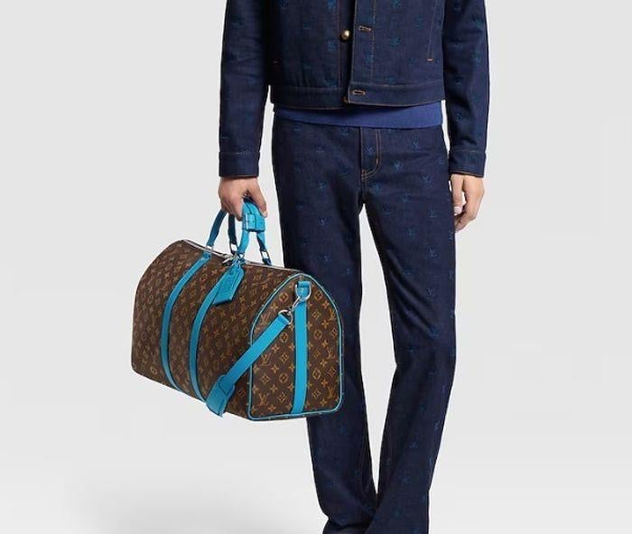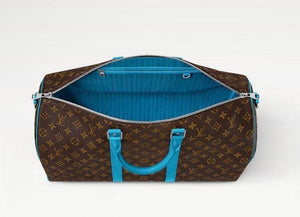 Travel in bold, contemporary style with the Keepall Bandoulière 50 crafted in Monogram Macassar canvas with bright blue accents, inspired by the iconic craftsmanship of Louis Vuitton. Designed for short trips and weekend getaways, this statement travel bag features a spacious interior, reinforced structure, and a detachable shoulder strap for versatile carrying. A perfect blend of classic monogram heritage and modern color contrast.