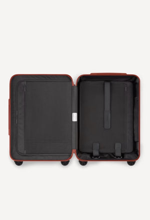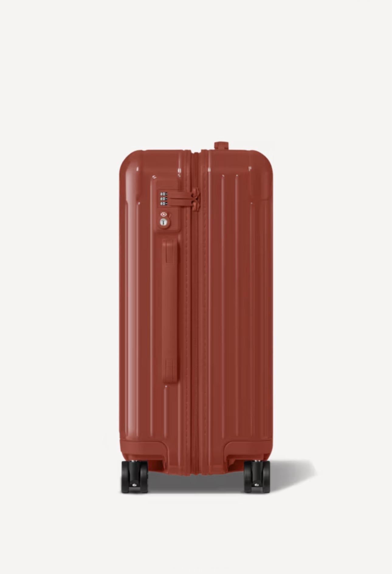 The RIMOWA Essential Cabin Travel Bag in Gloss Terracotta Red is a lightweight and stylish carry-on designed for short trips and business travel. Crafted with durable polycarbonate construction, this cabin-size travel bag offers reliable protection while maintaining easy handling and mobility. Its vibrant glossy terracotta red finish adds a bold, modern touch, making it a perfect choice for travelers who want both functionality and standout style.